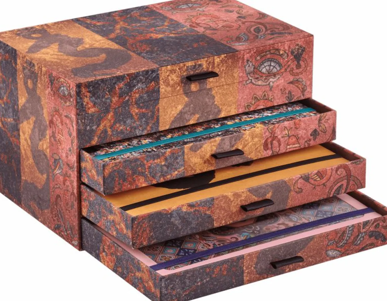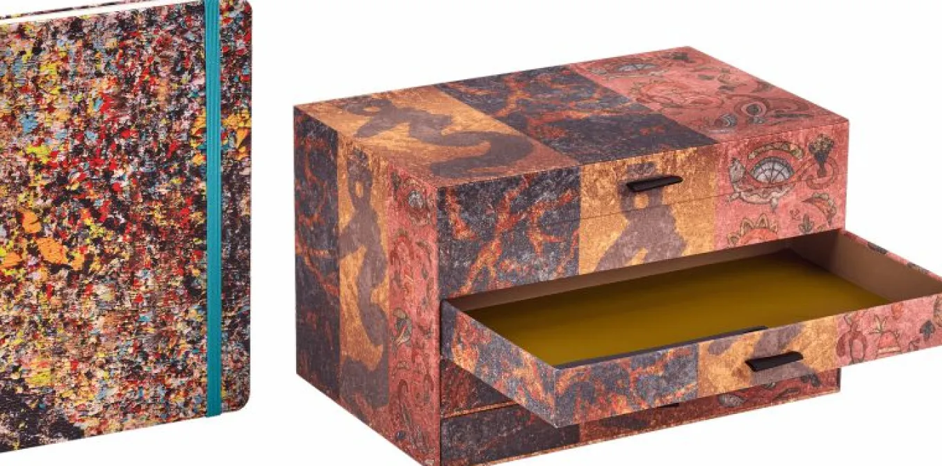 The beautiful giftbox – a work of art in itself – blends the different styles on its fabric-covered exterior, while the three notebooks await discovery within.