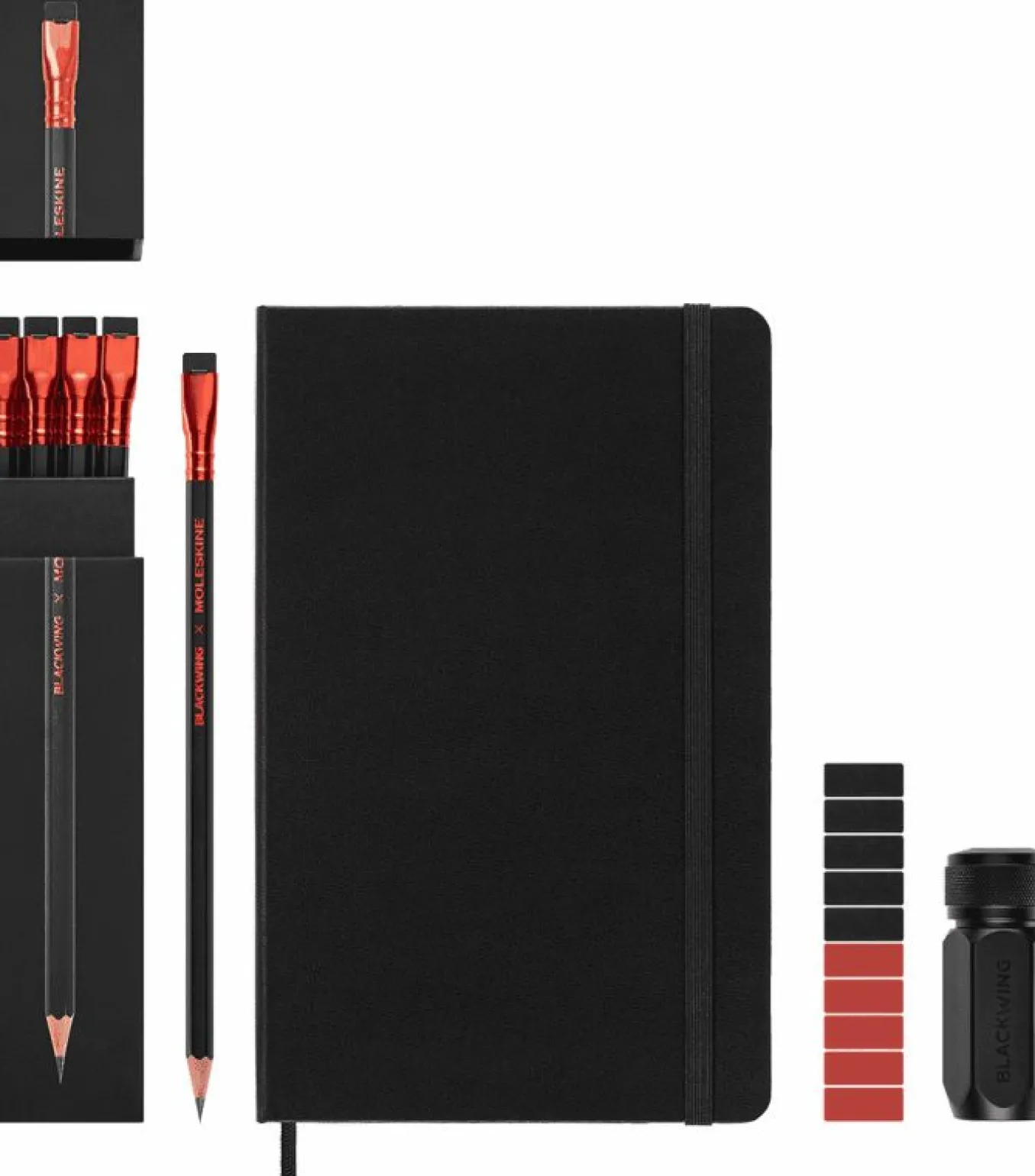 The Creative Set joins two legendary brands in one beautifully crafted gift set. Inside the box, you’ll find a year’s supply of 12 Blackwing Soft pencils for graphite pencil drawing and a large Moleskine Sketchbook, along with a pack of 10 Replacement Erasers and a One-Step Long Point Sharpener. This graphite pencil set has everything you need to start capturing your imagination on paper.