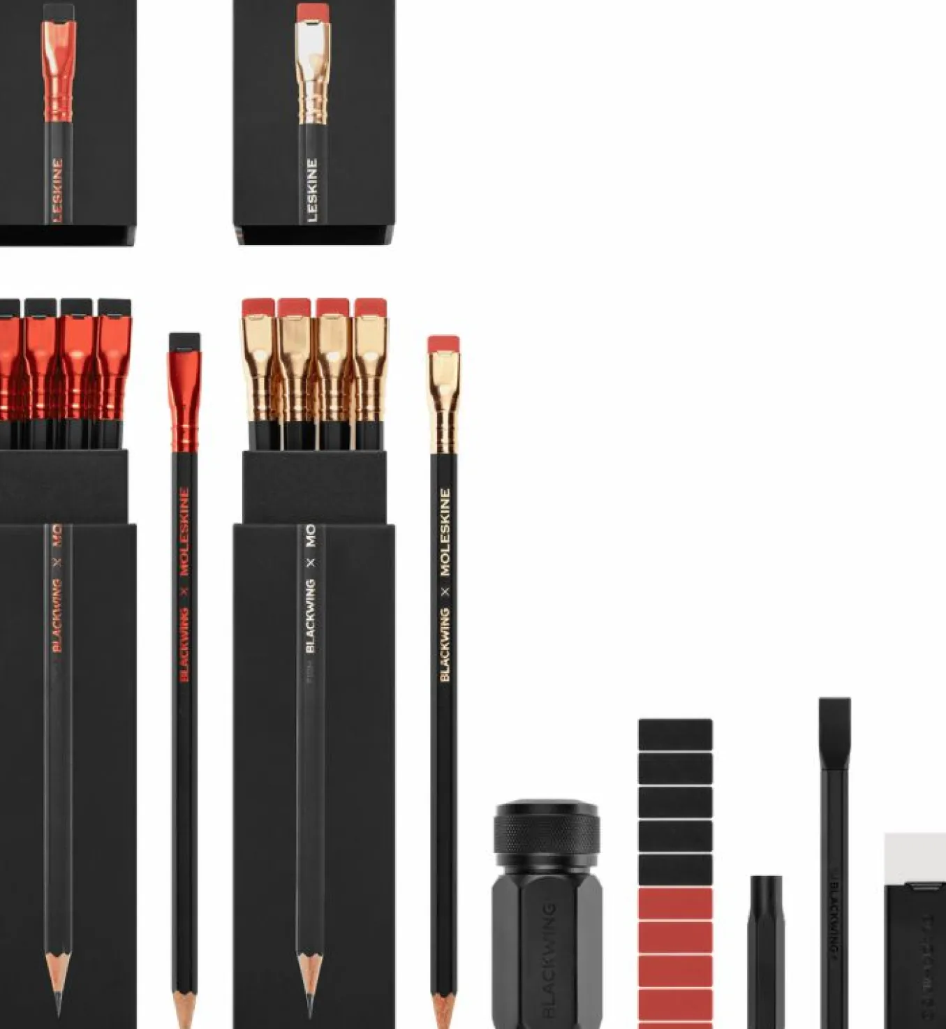 The Graphite Lover’s Set joins two legendary brands in one beautifully crafted gift collection. Inside the box, you’ll find a year’s supply of two kinds of iconic Blackwing graphite pencils: 12 Soft for drawing with depth and texture and 12 Firm for effortlessly smooth notes and sketches. The set also includes tools to look after and extend the life of your beloved Blackwing pencils: a One-Step Long Point Sharpener to keep them in tip top condition; a set of 10 Replacement Erasers; a Pencil Extender; and a Point Guard: tools for people who are truly passionate about pencils.