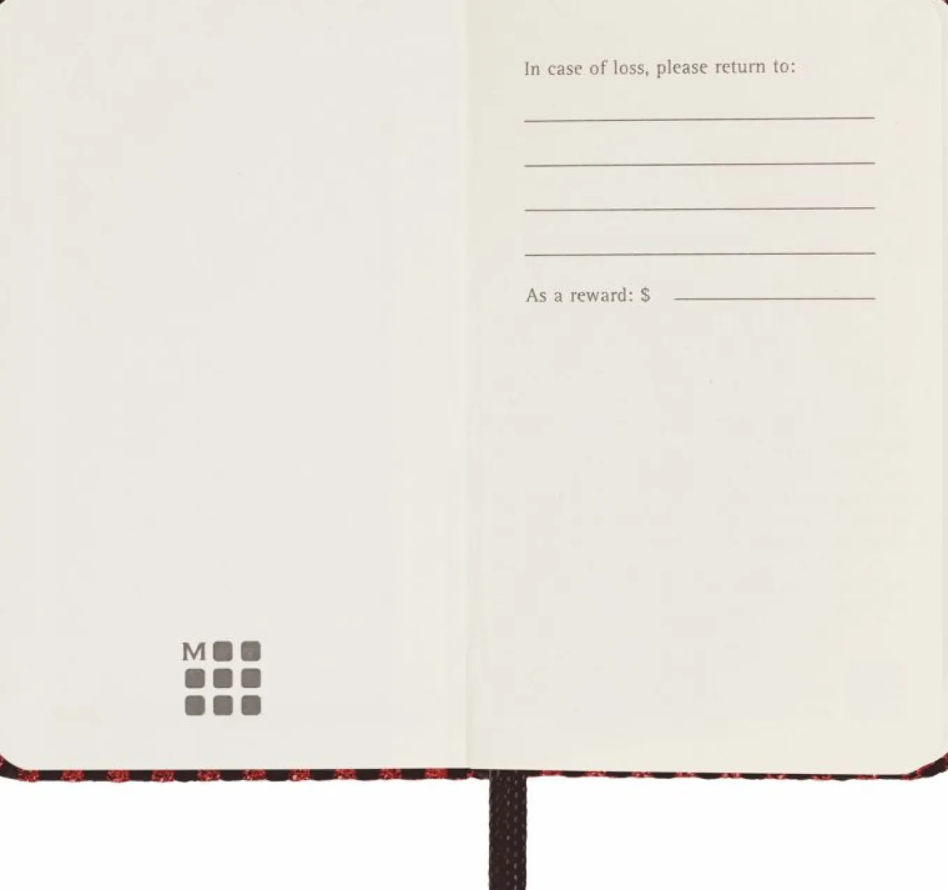 - ‘In case of loss’ printed on the flyleaf