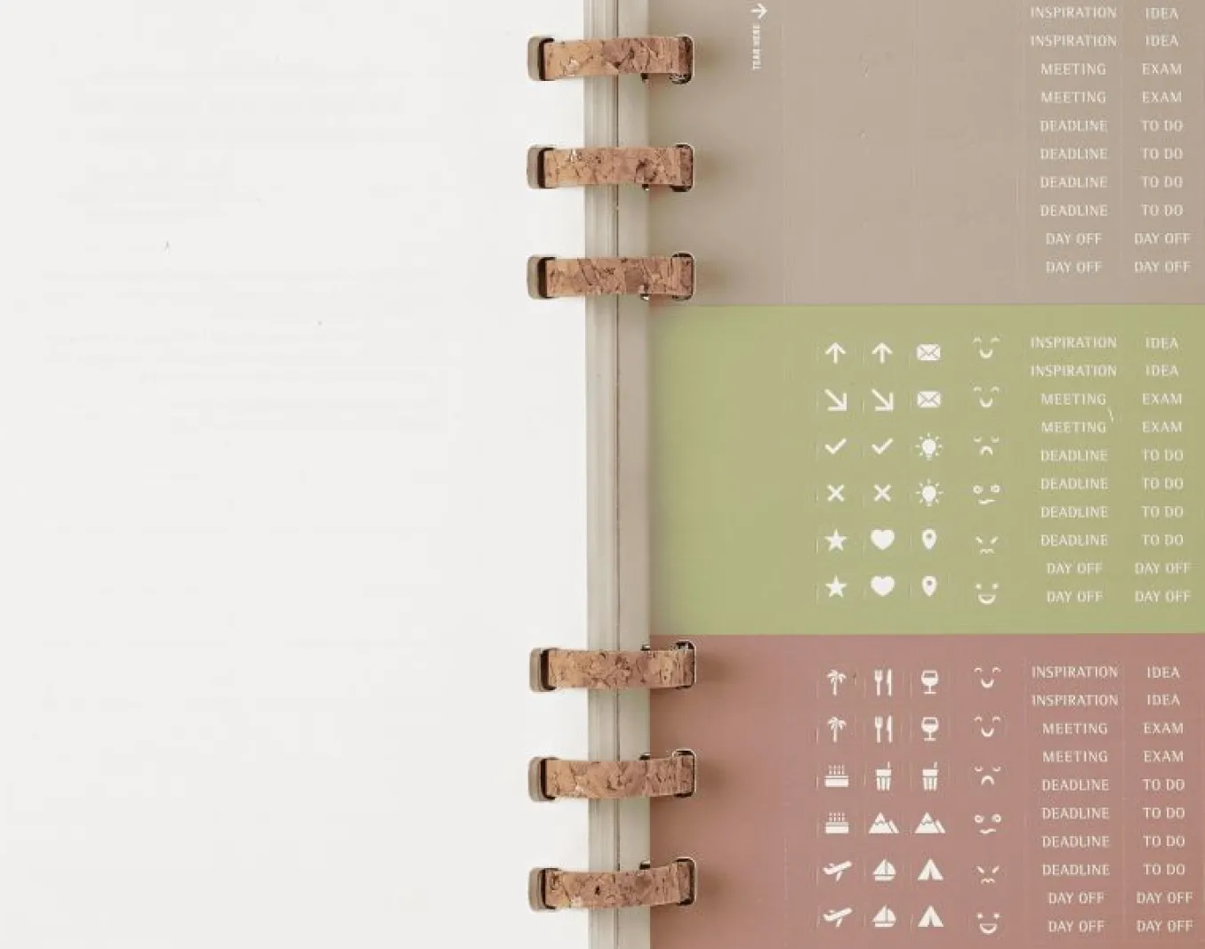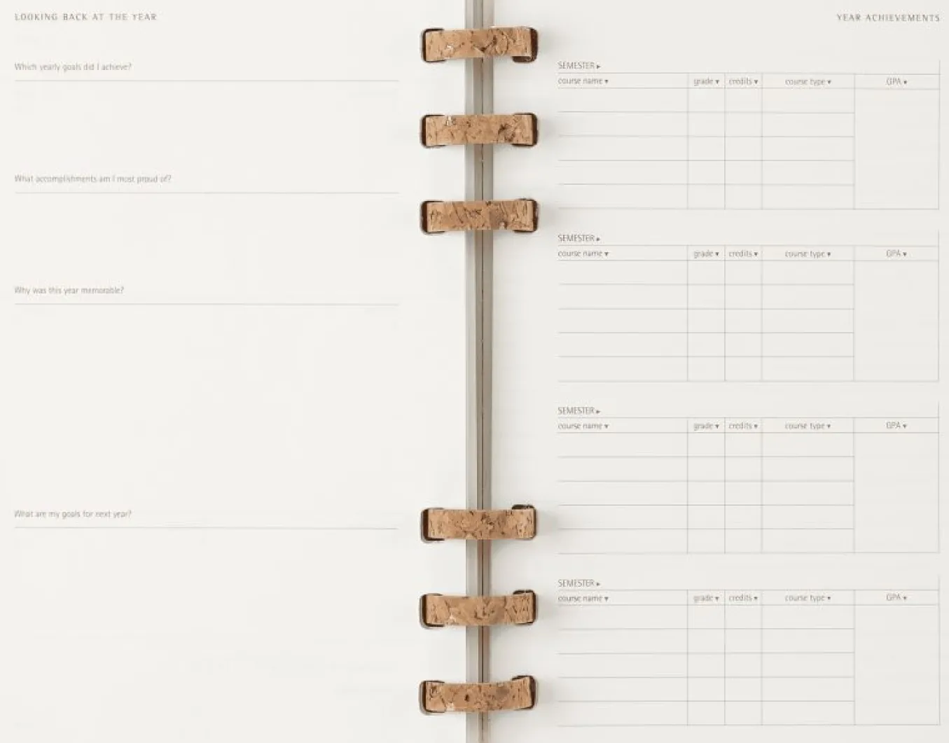 The special recipe of this cork-mix binding brings a sturdy, flexible, warm and original feel to the Student Life Planner.