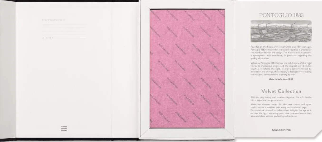 Moleskine chooses velvet by Pontoglio 1883 for the charm and quiet sophistication it breathes onto every ivory-colored page. This notebook and gift box are dressed in Italian velvet which delights the eye as it catches the light, enclosing your most precious handwritten notes within a perfectly plush exterior.