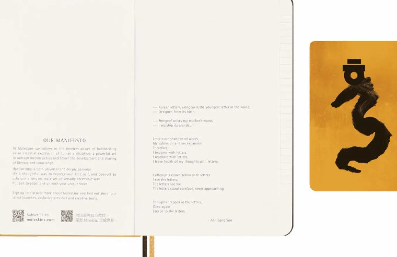 This Collector’s Box is part of the Moleskine 2024 Asian Collection. The collection unites three contemporary creatives from three diverse countries in a celebration of Eastern traditions: Japanese manga creator Momoko Sakura, Chinese artist Zeng Fanzhi, and South Korean typographic designer Ahn Sang Soo.