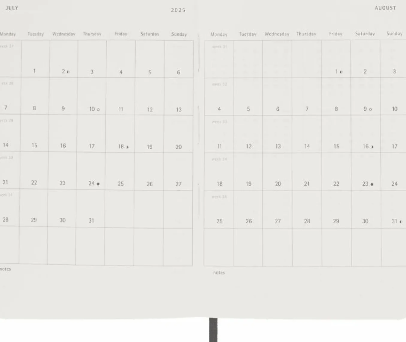 Choose between two different layouts to stay organised throughout 2025: Weekly Notebook and Weekly Horizontal. Weekly Notebook Planners show the days of each week on one side opposite a ruled page for tasks and notes, while the Weekly Horizonal layout displays the days of the week across two pages.